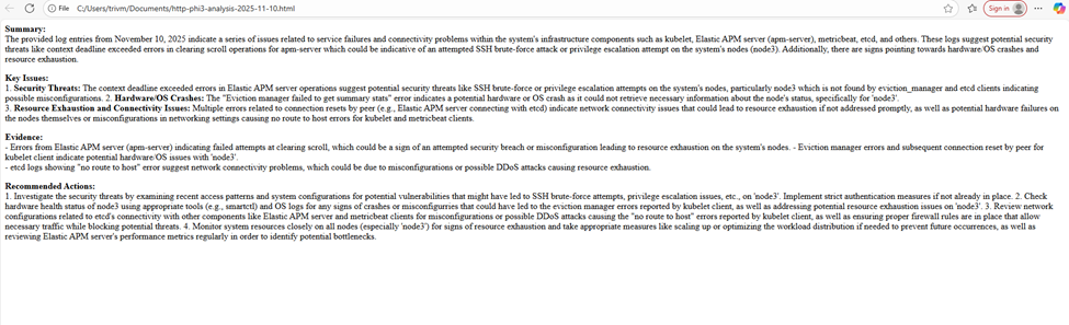 The AI model analyzes the data — identifying anomalies, security threats, or resource issues — and produces a Markdown report, which is then converted to HTML. The result: