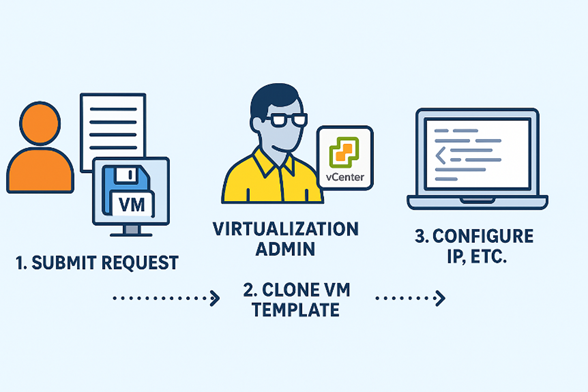 - A project/BU submits a request with OS and VM specs (CPU, RAM, Disk, Network) plus IP/Gateway/DNS.