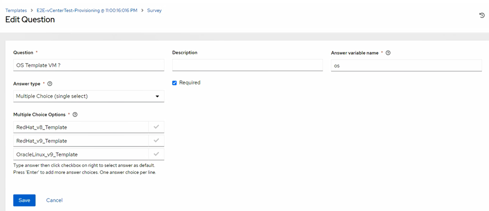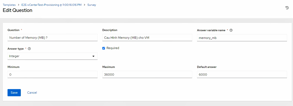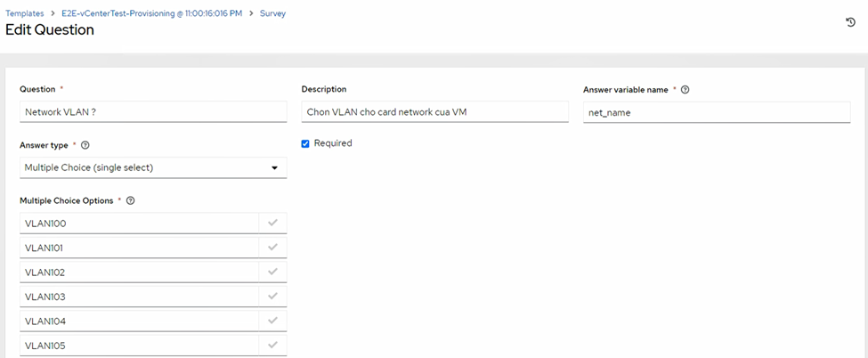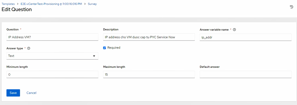 - Survey turns a playbook into a user-friendly form. Each field (CPU, RAM, VLAN, IP, Gateway, OS) becomes a runtime variable.