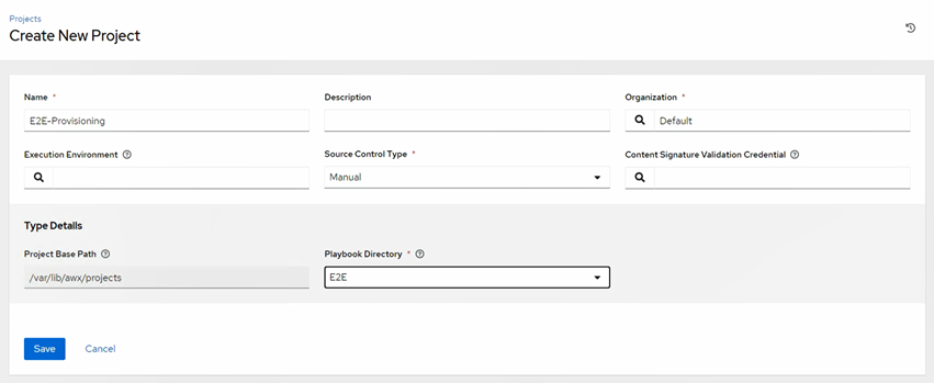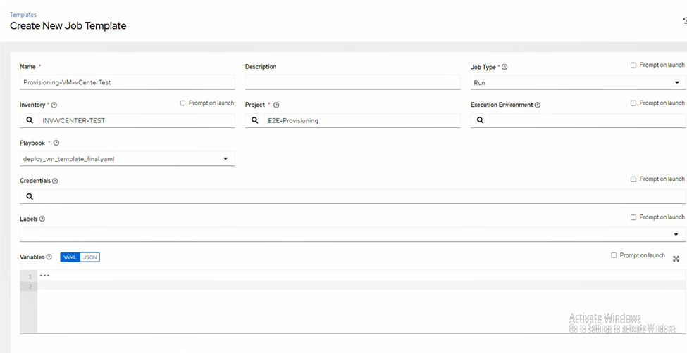 Select the inventory, project, and credentials, then choose your playbook deploy_vm_template_final.yaml with below content: